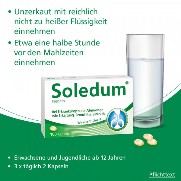 Erwachsene und Heranwachsende ab 12 Jahren nehmen 3 x täglich 2 Kapseln ein. In besonders hartnäckigen Fällen 4 x tgl. 2 Kapseln. Zur Weiter- und Dauerbehandlung reichen im Allgemeinen 2 xtgl. 2 Kapseln aus. Kinder von 2 bis 12 Jahren nehmen 3 x täglich 1 Kapsel ein. Soledum Kapseln sind auch für Diabetiker geeignet. Nehmen Sie Soledum Kapseln bitte unzerkaut mit reichlich nicht zu heißer Flüssigkeit (vorzugsweise ein Glas Trinkwasser [200 ml]) möglichst eine halbe Stunde vor dem Essen ein. Wenn Sie einen empfindlichen Magen haben, empfiehlt es sich, Soledum Kapseln während der Mahlzeiten einzunehmen. Die Dauer der Einnahme richtet sich nach Art, Schwere und Verlauf der Erkrankung. Bei Beschwerden, die länger als eine Woche anhalten, bei Atemnot, bei Fieber oder eitrigem oder blutigem Auswurf sollte ein Arzt auf gesucht werden. Bitte sprechen Sie mit Ihrem Arzt oder Apotheker, wenn Sie den Eindruck haben, dass die Wirkung von Soledum Kapseln zu stark oder zu schwach ist.