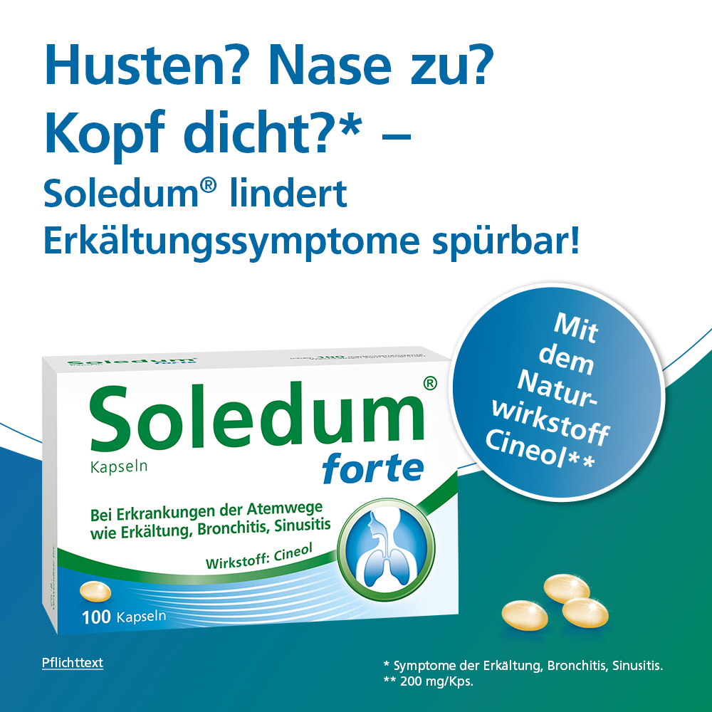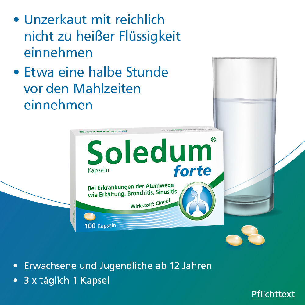 Der naturbasierte Wirkstoff Cineol wirkt schleimlösend und entzündungshemmend. Sinnvoll ist hierbei der Kontakt von Cineol mit dem Wirkort - der angegriffenen Schleimhaut der Atemwege. Dieser Kontakt erfolgt dadurch, dass Cineol nach der Einnahme der Soledum® Kapseln forte auf natürlichem Weg über die Blutbahn auch zur Lunge transportiert wird und dort abgeatmet wird.