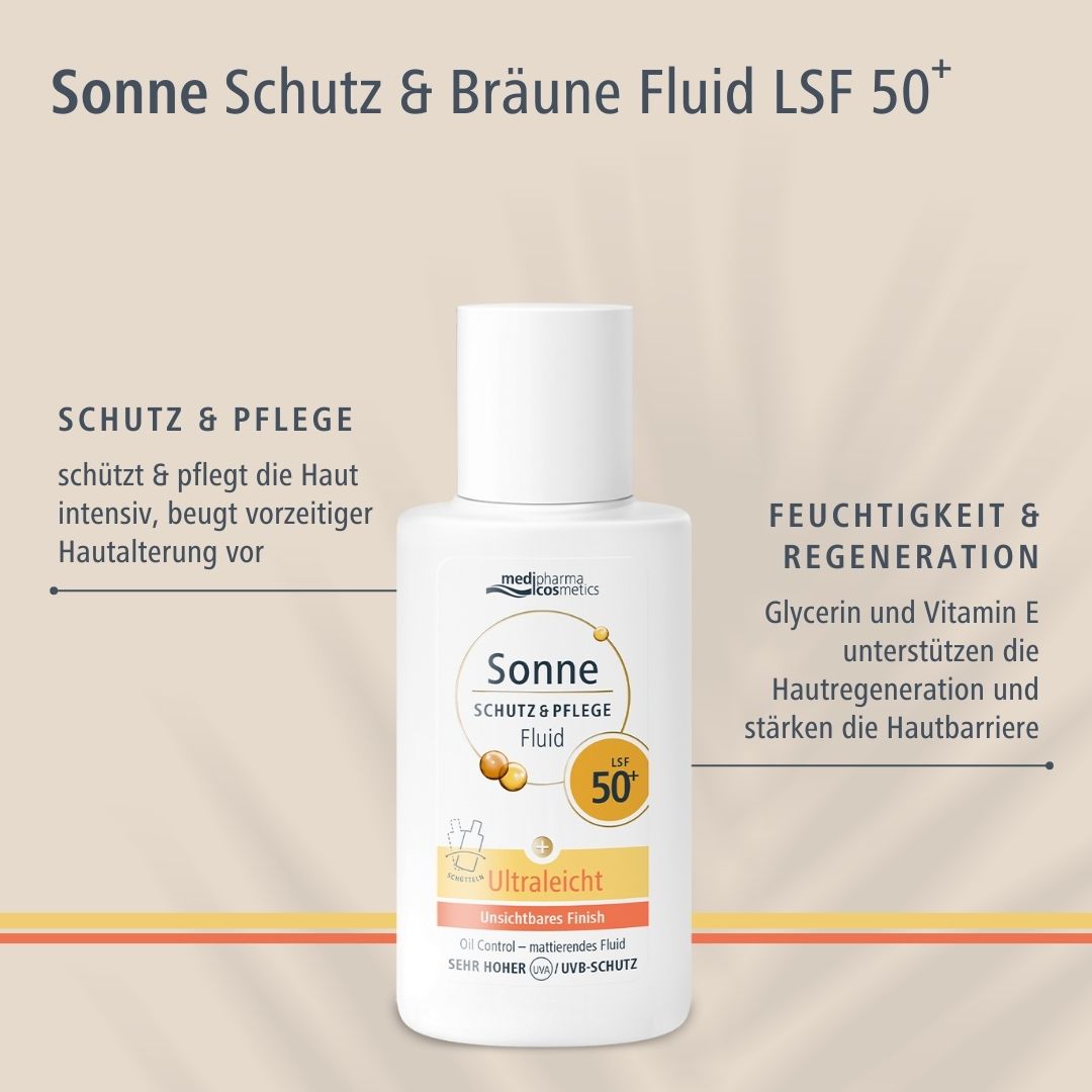 SONNE SCHUTZ & Pflege Fluid ultraleicht LSF 50+ Sonne Schutz&Pflege Fluid mit LSF 30 von medipharma cosmetics: Kombiniert zuverlässigen Sonnenschutz und intensive Feuchtigkeit mit mattem Finish