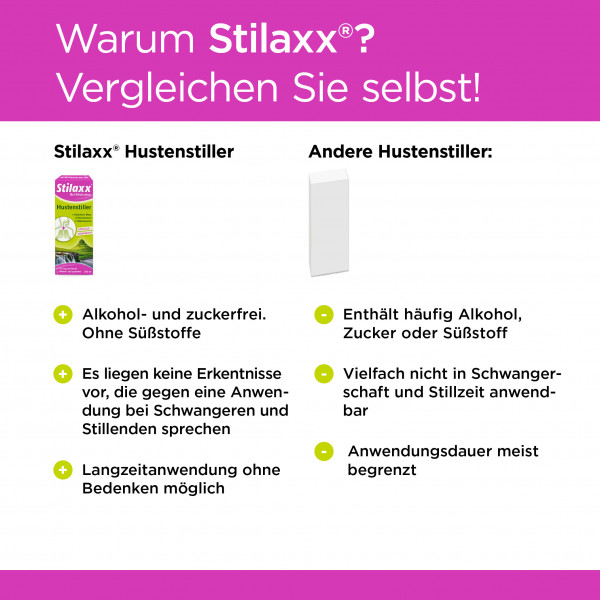 Für einen nachhaltigen Behandlungserfolg sollte die regelmäßige Einnahme des Stilaxx® Hustenstiller auch nach Abklingen des Reizhustens noch einige Tage fortgeführt werden.