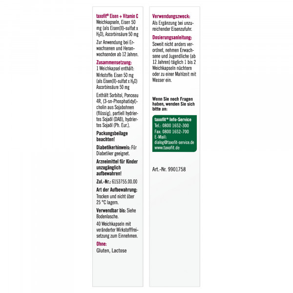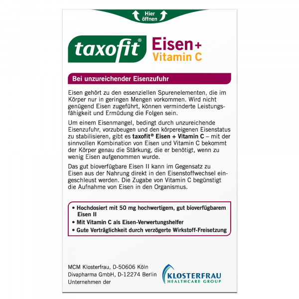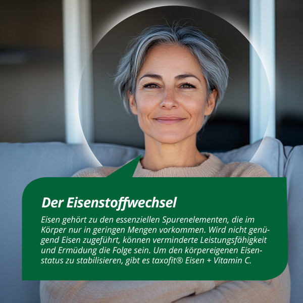 Eisen gehört zu den essenziellen Spurenelementen, die im Körper nur in geringen Mengen vorommen. Wird nicht genügend Eisen zugeführt, können verminderte Leistungsfähigkeit und Ermüdung die Folge sein. Um einem Eisenmangel, bedingt durch unzureichende Eisenzufuhr, vorzubeugen und den Körpereigenen Eisenstatus zu stabilisieren, gibt es taxofit® Eisen + Vitamin C - mit der sinnvollen Kombination von Eisen und Vitamin C bekommt der Körper genau die Stärkung, die er benötit, wenn zu wenig Eisen aufgenommen wurde. Das gut bioverfügbare Eisen II kann im Gegensatz zu Eisen aus der Nahrung direkt in den Eisenstoffwechsel eingeschleust werden. Die Zugabe von Vitamin C begünstigt die Aufname von Eisen in dem Organismus.