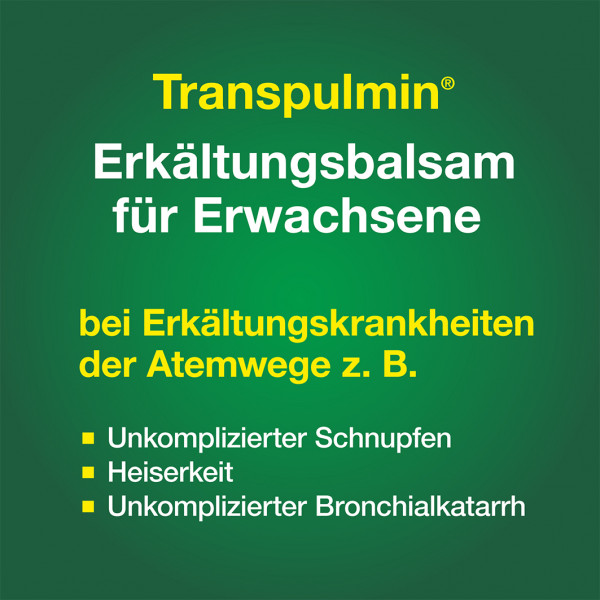 Transpulmin Erkältungsbalsam dient der äußeren Anwendung zur Verbesserung des Befindens bei Erkältungskrankheiten der Luftwege (wie unkomplizierter Schnupfen, Heiserkeit und unkomplizierter Bronchialkatarrh).