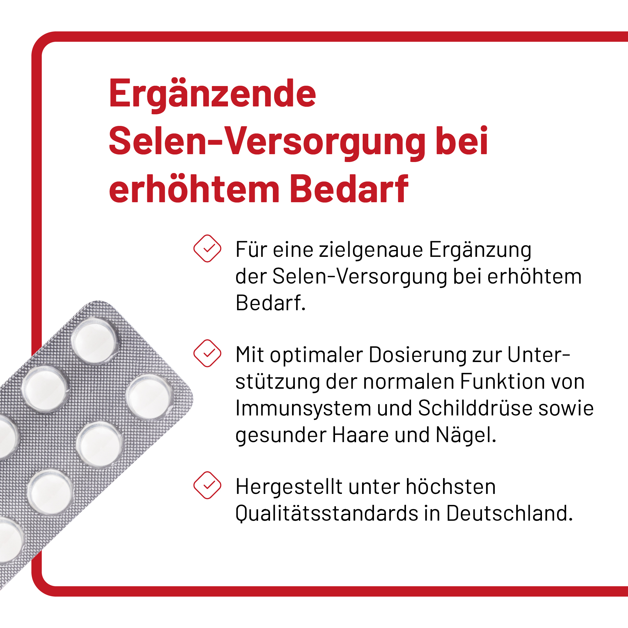 1 Tablette (= Tagesdosis) enthält 200 µg Selen (364% der Referenzmenge) gemäß Lebensmittelinformationsverordnung.