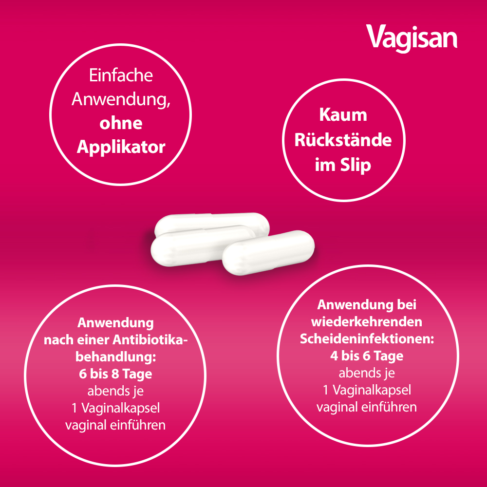 Nach bakteriellen oder bei wiederkehrenden Scheideninfektionen ist es besonders wichtig, die Scheidenflora zu stärken und das natürliche Gleichgewicht wiederherzustellen, um erneuten Infektionen vorzubeugen. Das Präparat enthält dafür folgende lebende Mikroorganismen: Die Stämme L. gasseri DSM 14869 und L. rhamnosus DSM 14870. Die Laktobazillen vermehren sich angeregt durch die Scheidenflüssigkeit und besiedeln die Vagina. Das Besondere: Die enthaltenen Laktobazillenstämme produzieren im Scheidenmilieu Milchsäure aber auch Substanzen, die Keime abwehren. Hierdurch tragen sie zur Stabilisierung bzw. zum Wiederaufbau des physiologischen pH-Werts in der Scheide bei und zur natürlichen Abwehr von pathogenen Keimen. Dies unterstützt z. B. die Flora von Frauen, die zu wiederholten Scheideninfektionen neigen und bei denen der pH-Wert häufiger aus dem natürlichen Gleichgewicht gerät. Durch die Behandlung mit Vagisan® ProbioFlora Milchsäure-Bakterien Vaginalkapseln können weitere Scheideninfektionen vorgebeugt werden.