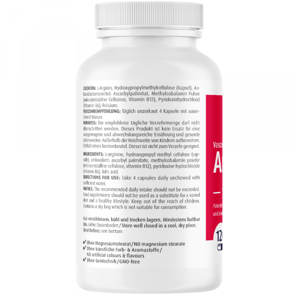 Unsere Vascorin® Arginin Plus Kapseln bieten eine praktische Ration für einen Monat mit 120 Kapseln, die für 4 Wochen oder 30 Tage ausreicht. Bei uns finden Sie nur hochwertige Inhaltsstoffe, denn unsere Kapseln enthalten zu 100 % reine Zutaten. Unsere Vascorin® Arginin Plus Kapseln leisten einen wertvollen Beitrag zur Gesundheit, da die enthaltenen Vitamine auf vielfältige Weise die Gesundheit fördern. Sie tragen unter anderem zur gesunden Blutbildung und einem normalen Homocysteinspiegel bei. Zudem sind unsere Kapseln frei von unerwünschten Zusatzstoffen wie Magnesiumstearat und zu 100 % vegan. Sie sind zudem frei von Zucker, Gluten, Laktose und Soja. Um Ihnen höchste Qualität zu gewährleisten, wird unser Produkt regelmäßig von unabhängigen deutschen Laboren geprüft. Die Entwicklung und Produktion erfolgen durch unsere Pharma-Experten in unserer eigenen Produktion im hessischen Nauheim.
