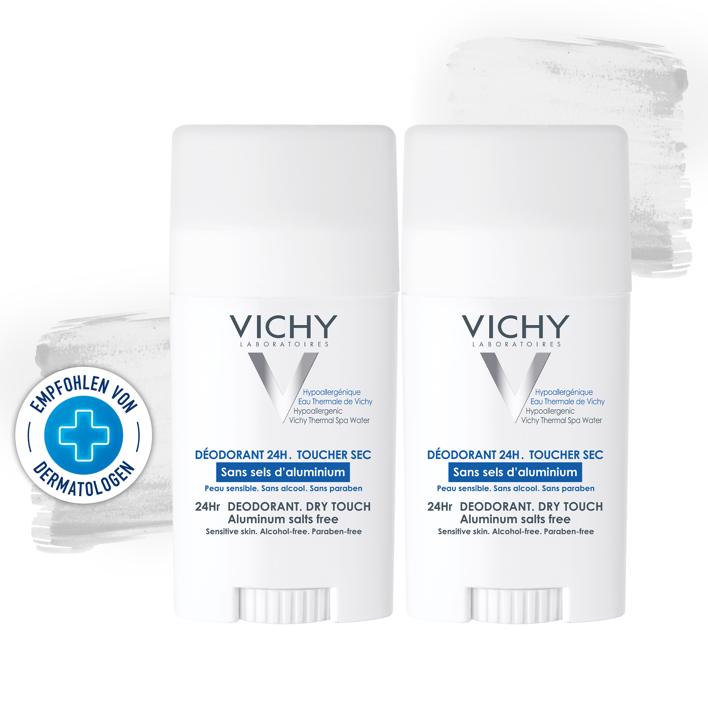Ein wirksames Deo ohne Aluminium wie der 24h Stick für Frauen von Vichy ist für empfindliche Haut geeignet und pflegt die Achseln.