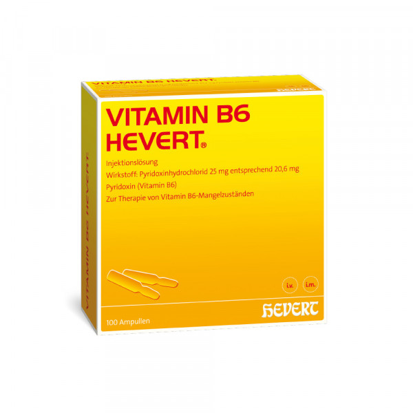 Vitamin B6 Hevert Anwendungsgebiete: Behandlung eines Vitamin B6-Mangels, soweit eine orale Arzneimittelgabe nicht möglich ist. Zu Risiken und Nebenwirkungen lesen Sie die Packungsbeilage und fragen Sie Ihren Arzt oder Apotheker.