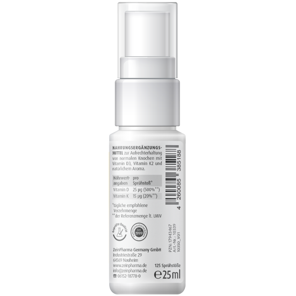 - Optimal dosiert: In nur einem Sprühstoß sind 1000 I.E. Vitamin D3 und 15 μg Vitamin K2 zur Deckung des Tagesbedarfs enthalten