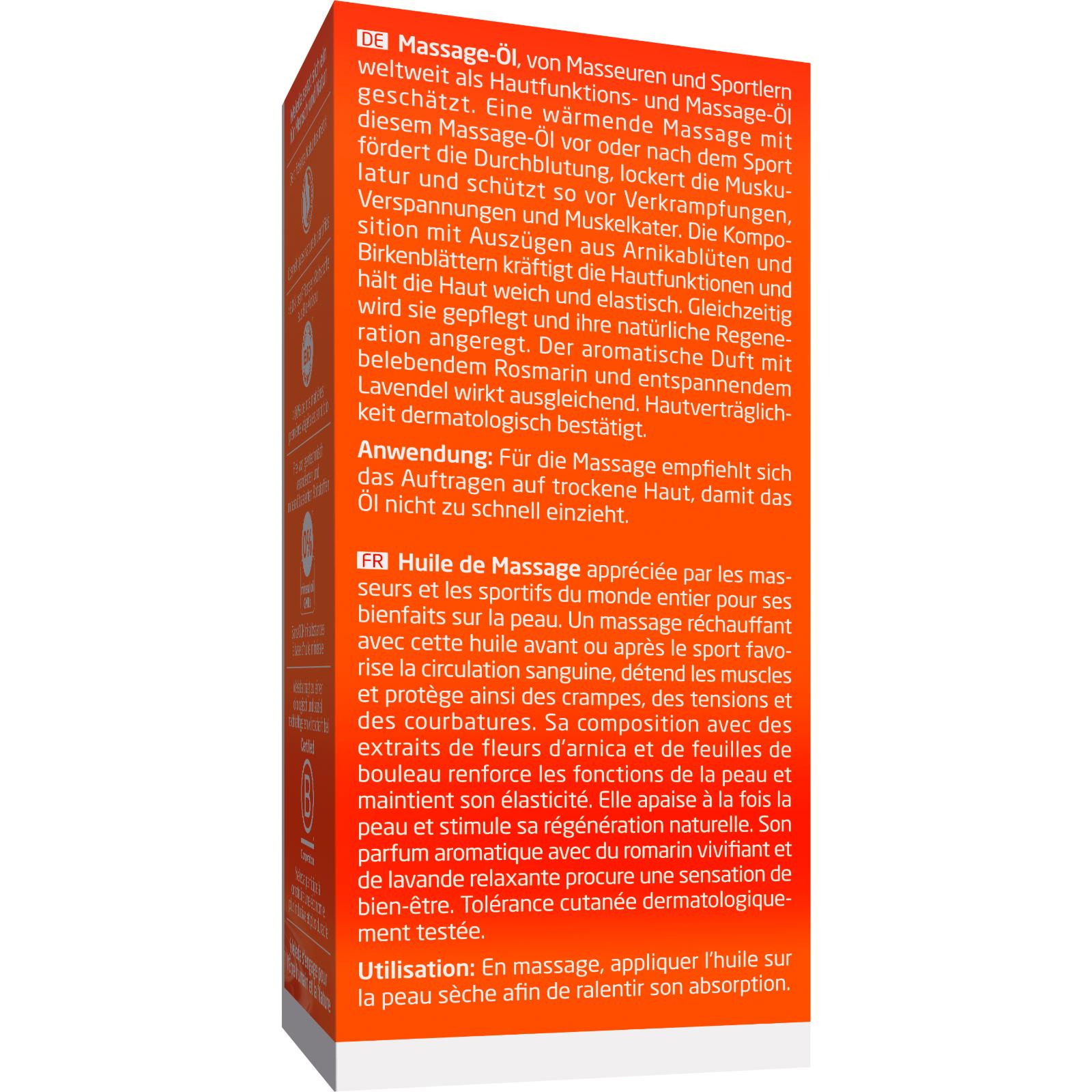 Zur Massage auf die Handfläche geben und damit, je nach Körperteil, sanfte bis kräftige Streich-, Klopf-, Knet- oder Vibrationsbewegungen ausführen. Zur täglichen Hautpflege nach Dusche oder Bad sparsam in die noch leicht feuchte Haut einreiben, so lässt sich das Öl gut verteilen und zieht rasch ein, ohne einen Fettfilm zu hinterlassen. Verschluss sauber halten.