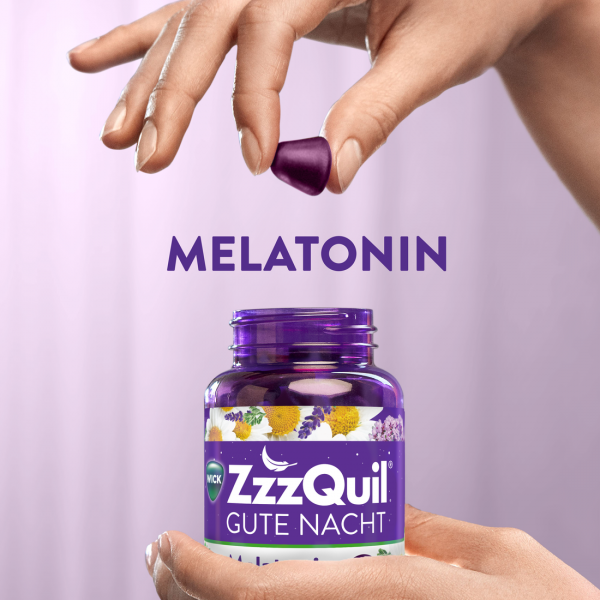 WICK ZzzQuil Gute Nacht enthält 1 mg Melatonin - ein Hormon, das auch auf natürliche Weise von unserem Körper als Schlafsignal gebildet wird und den Schlafrhythmus koordiniert. Das Hormon arbeitet mit unserer inneren Uhr zusammen und hilft uns schneller einzuschlafen, ohne dass es zu Müdigkeit am nächsten Tag führt. Es baut sich nach ca. 7 Stunden im Körper ab. WICK ZzzQuil Gute Nacht kann bei Bedarf eingenommen werden, ohne dass es zu einem Gewöhnungseffekt kommt. Täglich kann eines der innovativen Weichgummis eingenommen werden.
