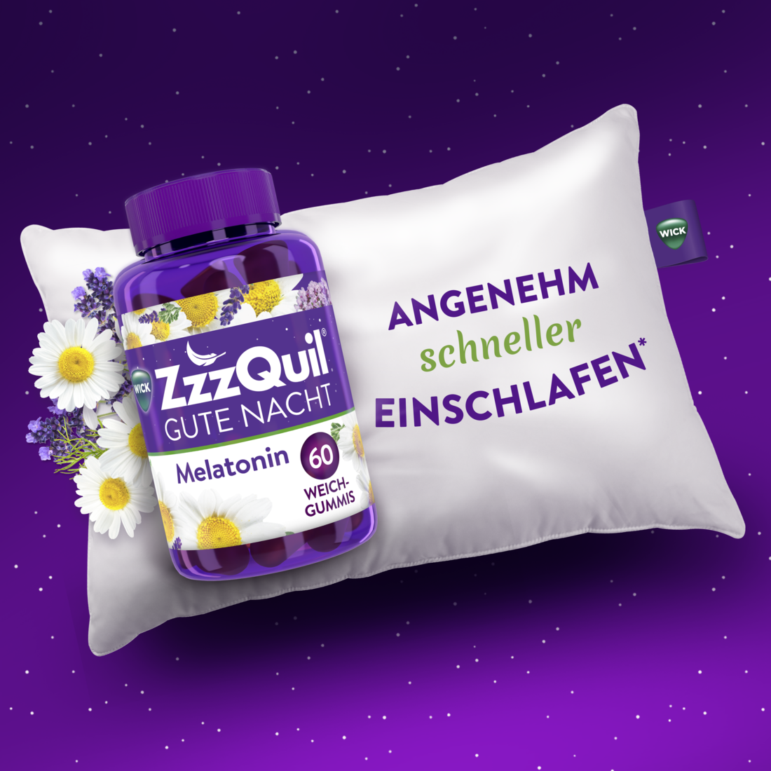 Wenn man sich ausgeschlafen fühlt, ist man für Höchstleistungen bereit. Doch häufig lässt einen der Alltag abends nicht zur Ruhe kommen und einschlafen. Für diese Momente wurde die Einschlafhilfe WICK ZzzQuil Gute Nacht entwickelt: Innovative Weichgummis, die dir helfen schneller einzuschlafen und somit am nächsten Tag erholter aufzuwachen.