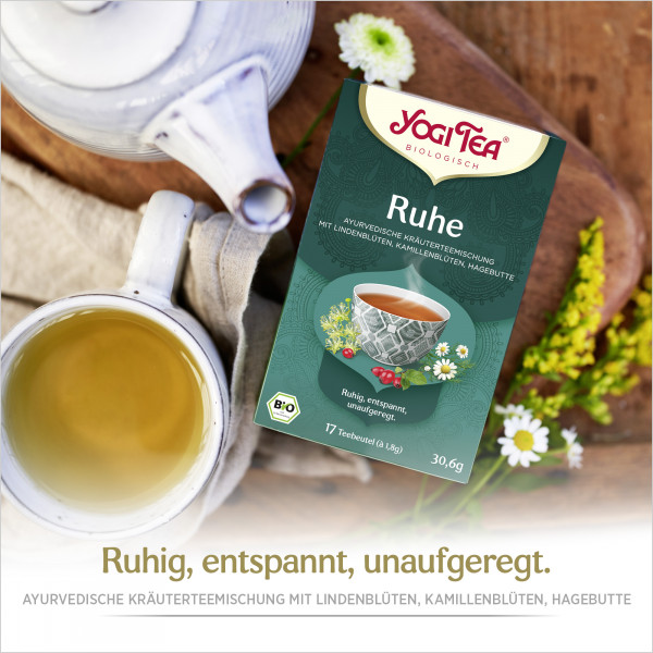 Ayurveda - die ganzheitliche Lehre vom Leben - interessiert sich vor allem für die praktisch-alltägliche Lebensführung der Menschen. Ihr geht es darum, den Menschen in seinem natürlichen Gleichgewicht zu halten. Balance ist das Ideal eines gesunden, glücklichen und spirituellen Lebens. \"Walk in balance on Mother Earth!\" Wir erleben in unserem täglichen Leben, wie Stress und Spannungen uns aus dem Gleichgewicht bringen. Ist es nicht Zeit, inne zu halten? Ein Verlangen nach einer neuen Langsamkeit entsteht. Ein Ruf zum Umdenken: Nur in Ruhe und im Innehalten erinnern wir unserer inneren Werte. YOGI TEA® Ruhe Tee ist eine sanfte, milde Mischung aus Kräutern und Gewürzen. Sie ist so herrlich ausgewogen, dass einige Tässchen reichen, um wieder zu mehr Gelassenheit zu finden.